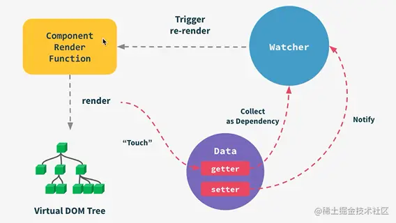 ps:执行render函数模板编译时候就已经触发了getter,然后收集依赖触发哪个getter就watcher哪个,后续修改时候看修改的data是不是之前被watcher的data,如果是就重新触发render。