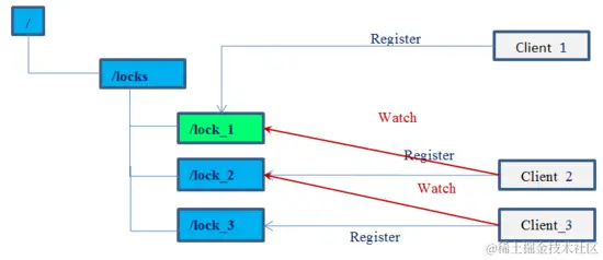 下图中,进程Client_1,Client_2,Client_3同时申请锁在locks先后创建的lock_1,lock_2和lock_3节点,其中进程1创建的lock_1节点最小所以先获得锁,client_2监听lock_1,client_3监听lock_2,它们将先后获得锁。