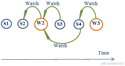 下图中S1、S2、S3、S4为度操作,W2、W3为写操作,S1、S2将先获得读锁。W2监听S2,S3和S4监听W2,它们需要等等待W2释放锁后获得锁。