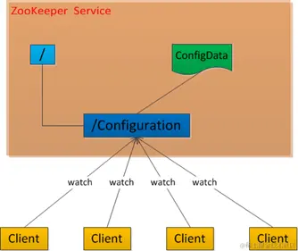 像这样的配置信息完全可以交给 Zookeeper 来管理,将配置信息保存在 Zookeeper 的某个目录节点中,然后将所有需要修改的应用机器监控配置信息的状态,一旦配置信息发生变化,每台应用机器就会收到 Zookeeper 的通知,然后从 Zookeeper 获取新的配置信息应用到系统中。