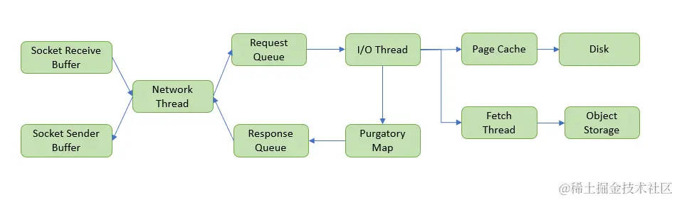 - 生产者记录落在套接字接收缓冲区上。网络线程之一拾取消息并将其传递到共享请求队列。