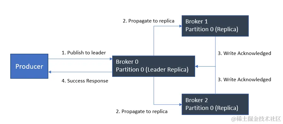 Kafka 生产者将数据写入分区的当前领导代理。如果我们希望消息在被视为成功写入之前必须写入最少数量的副本,我们需要设置在被视为成功写入之前acks需要确认收到消息的代理数量。