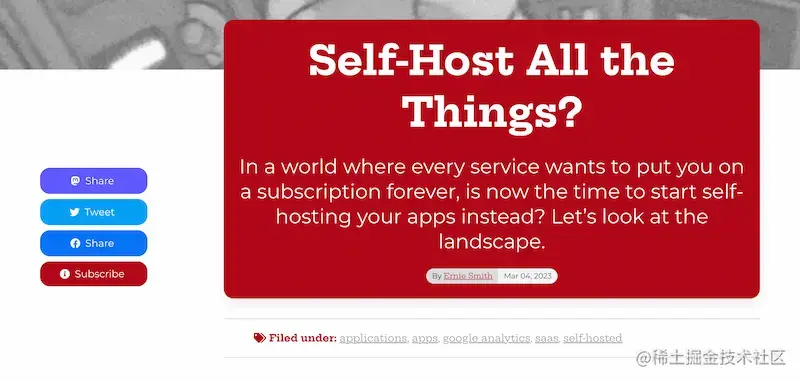 作者决定自托管几项服务:访客统计、邮件列表、无代码工具、日历。他逐一分析了这几项服务可用的开源产品。