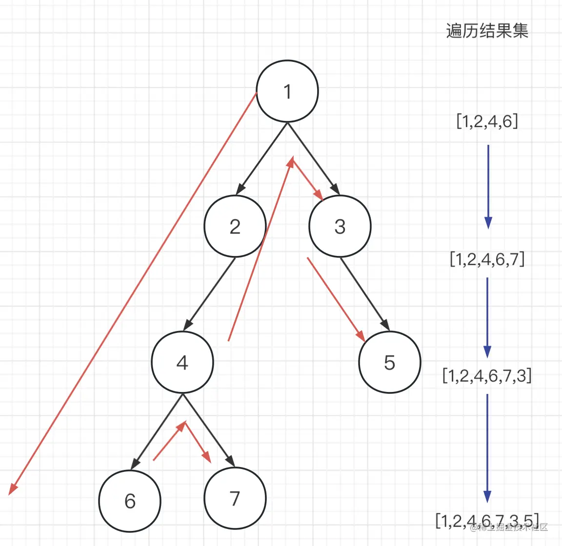 顾名思义,深度优先遍历就是先考虑先往深了找,具体的又分为了 先序遍历、中序遍历、后序遍历,拿先序遍历举例,看图: