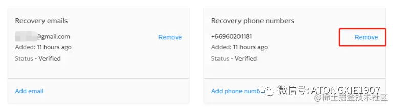 注册成功以后,可以在Account Security界面移除用于验证的手机号码,并添加自己的电子邮箱作为辅助验证的方式,如图: