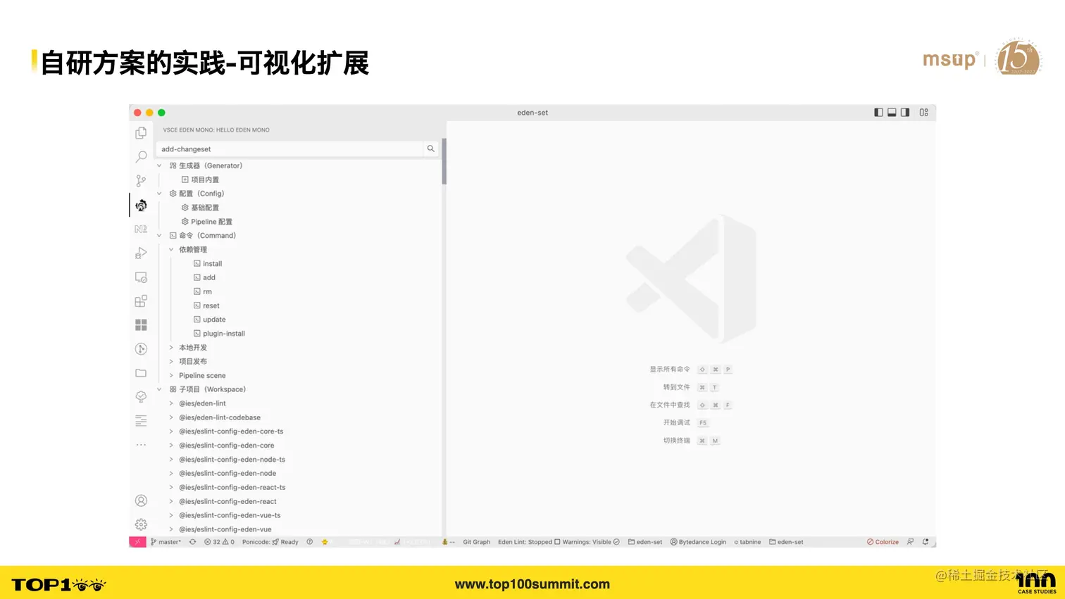 - 可视化扩展方面,我们通过界面教育和引导用户,提供快捷操作创建子应用、调用各类命令、搜索子应用、配置 Monorepo 等;