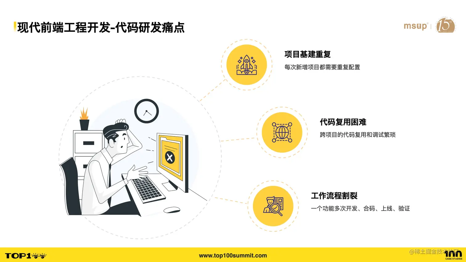 那么,在上述这些个趋势下,我们的前端工程开发面临了哪些痛点呢?主要有三个: