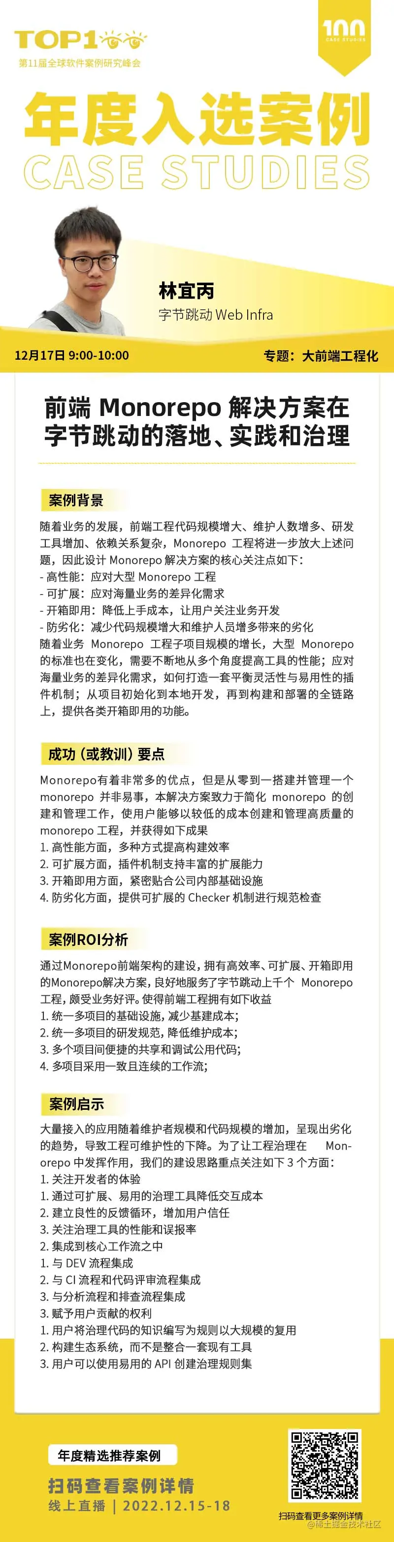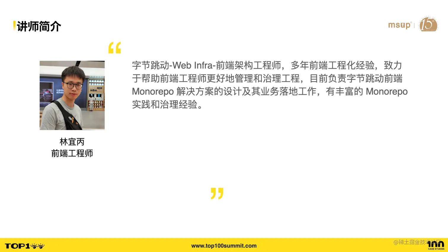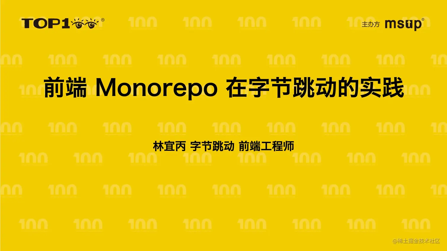 - 大家早上好,我是林宜丙,今天我带来的分享主题是《前端 Monorepo 在字节跳动的实践》