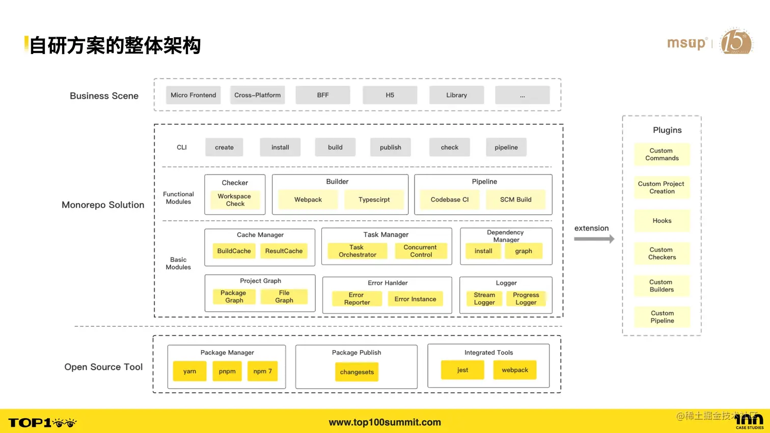 - 此处简述我们自研方案的整体架构,主要分为三层,底层是开源工具层,即我们依赖的开源方案,有 npm 包管理器,changesets 版本管理工具,子应用集成工具,比如 jest 和 webpack 等;
