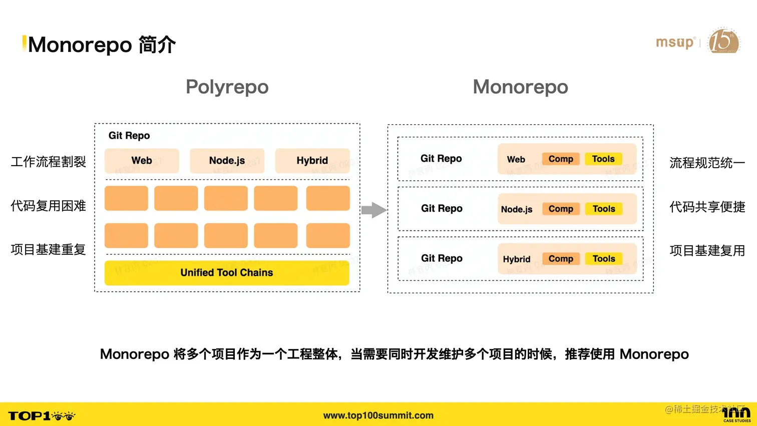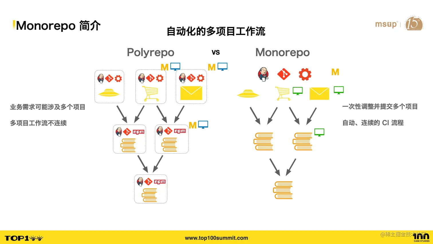 - 再次,在 Monorepo 里能够实现自动化的多项目工作流,从而解决工作流程割裂的痛点。