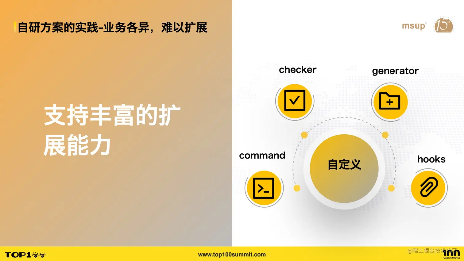- 因此在面对这些不同业务的扩展需求方面,我们通过插件机制支持用户自定义命令,Checker,生成器,并暴露整个生命周期的钩子,以提供更灵活的扩展能力