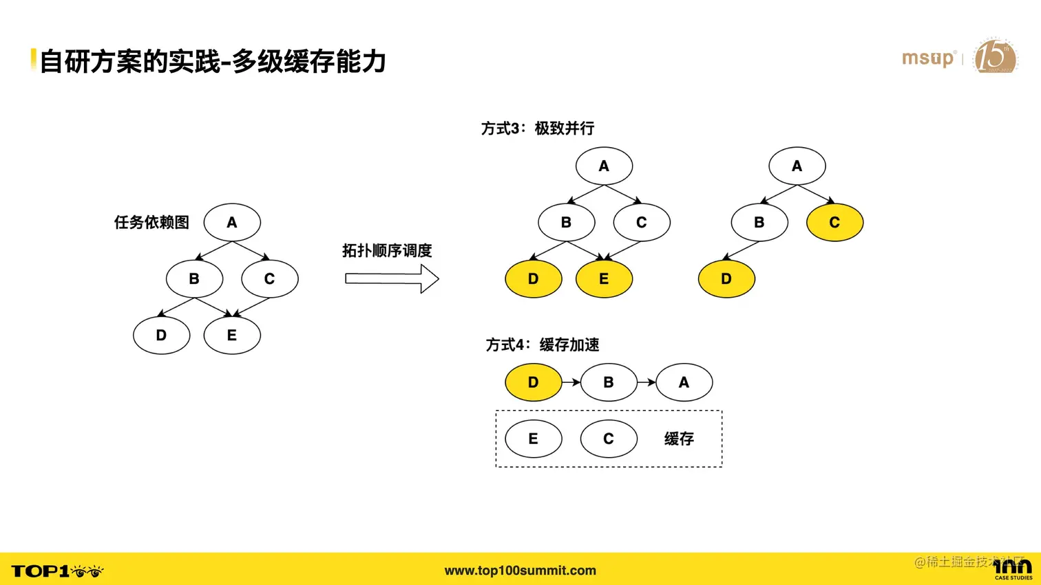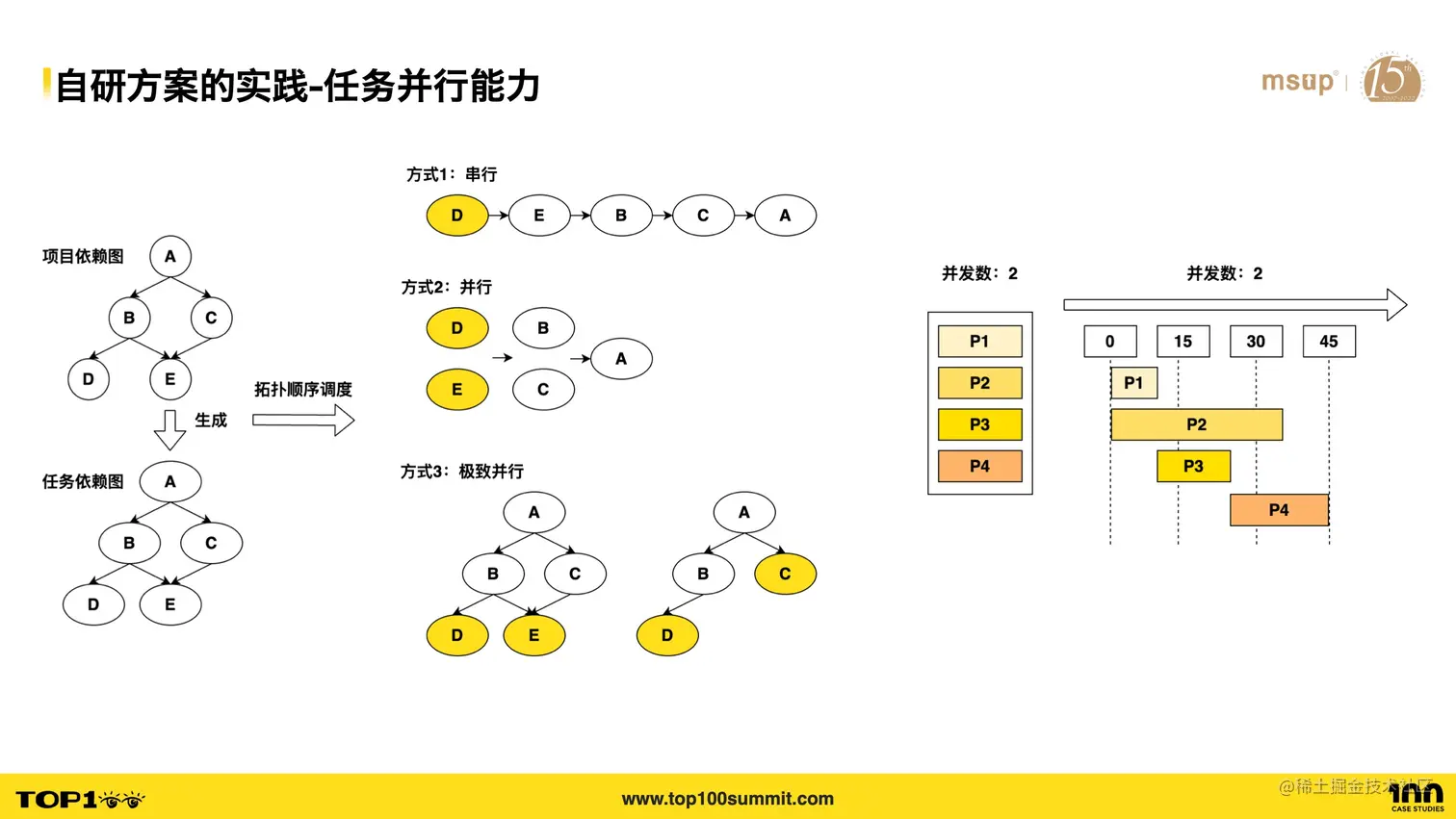 - OK,我们看方式一,一种最朴素的方式,即通过串行排成 DEBCA,这是能够符合构建要求的;但是它的性能是比较低的,比如 D 和 E 是可以并行的,所以第二种方式就是通过把 DE 以及 BC 进行并行处理,这样便能把前面的 5 个步骤加速到 3 个步骤。但这种优化还不够极致,我们发现任务 C 呢,不依赖任务 E 的完成,但是方式二下,任务 C 却得等待 D 和 E 都完成才开始执行。
