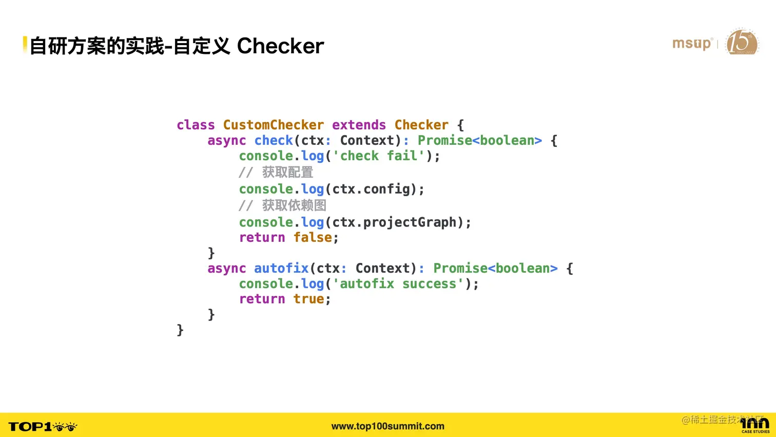 - 如果内置的 Checker 不满足用户对于规范的需求呢?我们也提供了自定义 Checker 的能力,在每个 Checker 内部,我们注入当前 Monorepo 工程的配置和依赖图等上下文信息,Checker 开发者便能通过这些信息去 check 当前的工程是否符合规范。