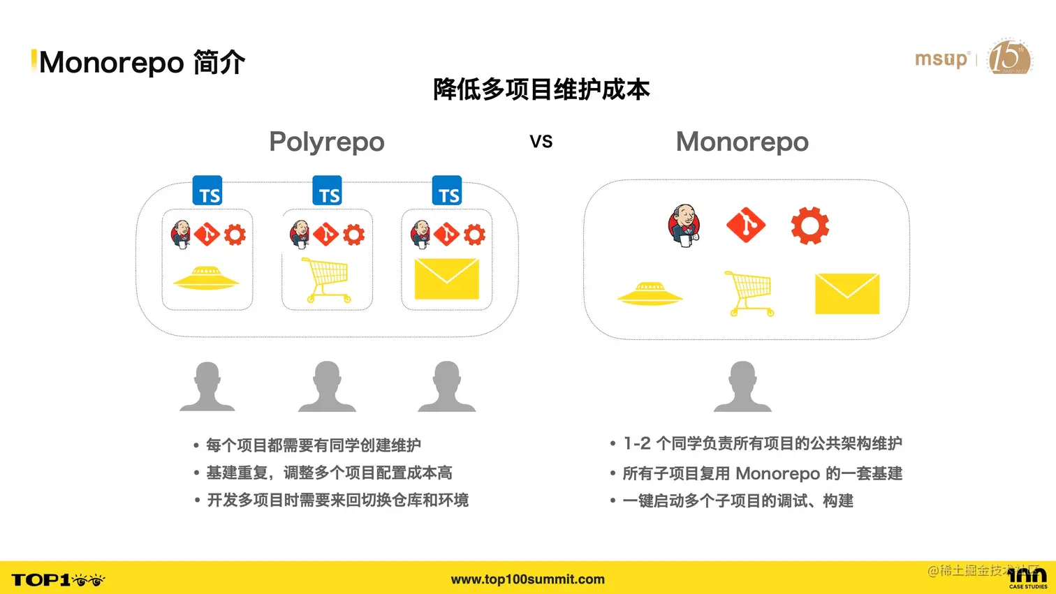 - 此外,Polyrepo 下,多个项目的基建有很多重复,当团队有多个项目的时候,需要频繁创建 git 仓库,配置 CI、Lint 规则、构建等等,而且为每个项目创建的基建后续都需要有人来维护。