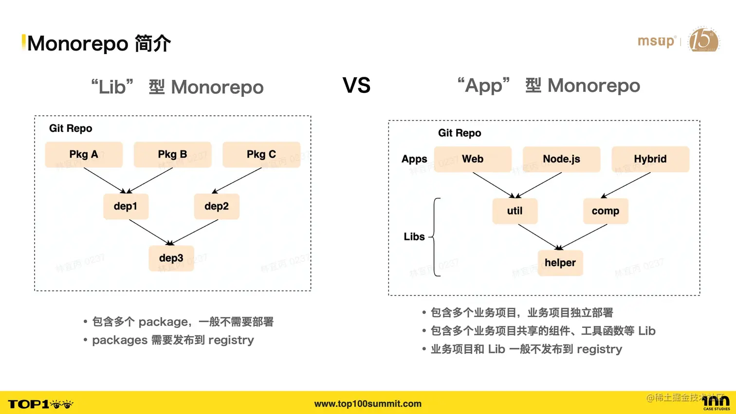 - 除了 Lib 型以外,我们看右边这张图,多个 App 也是可以放到一个仓库中维护的,这就是 App 型的 Monorepo,它包含多个 App 项目,以及项目共享的组件、工具函数等等,App 类型的项目需要走完整的部署流程,App 及其依赖的 Lib 一般不需要发布到 npm registry,这类项目呢,才是商业公司的主流。