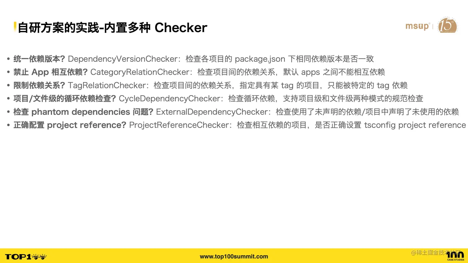 - 我们内置了多种 Checker,用于保证基本的可维护性,比如统一依赖版本,它会检查各项目的 package.json 下相同依赖版本是否一致等等