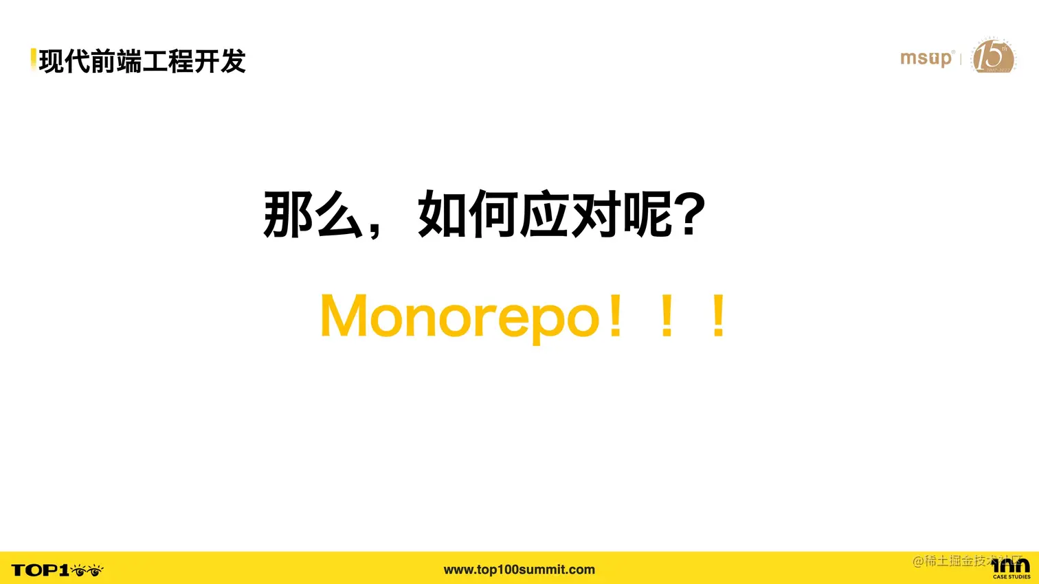 - 第二个是随着业务的迭代,Monorepo 工程的规模,即子应用数量迅速增多,而一次调试和构建往往涉及多个子应用,从而导致调试、构建性能下降