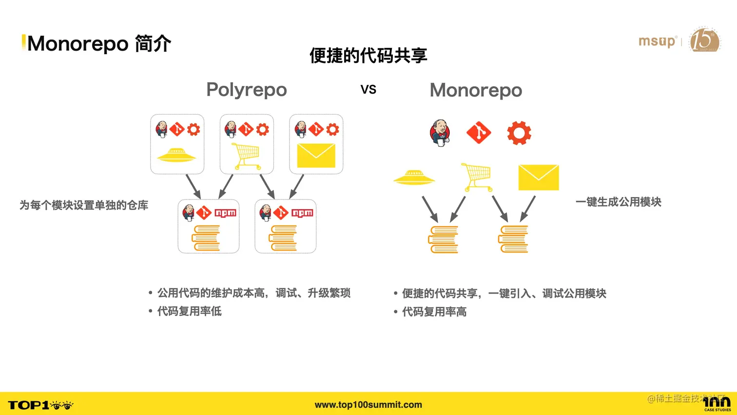 - 那为什么要采用 Monorepo 呢?接下来我们看看使用 Monorepo 的收益都有哪些?它是如何解决我们遇到的痛点的?