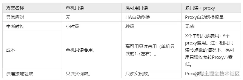 单机只读、高可用只读、多只读 + proxy,在应用并发连接数、异常反应、成本方面的对比如下: