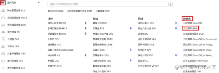 3. 单击页面左上角的符号,选择 “数据库> 云数据库 RDS”。