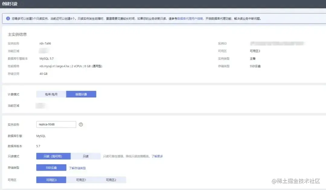 5. 在 “创建只读” 页面,只读模式选择 “只读(高可用)”,填选实例相关信息后,单击 “立即创建”。