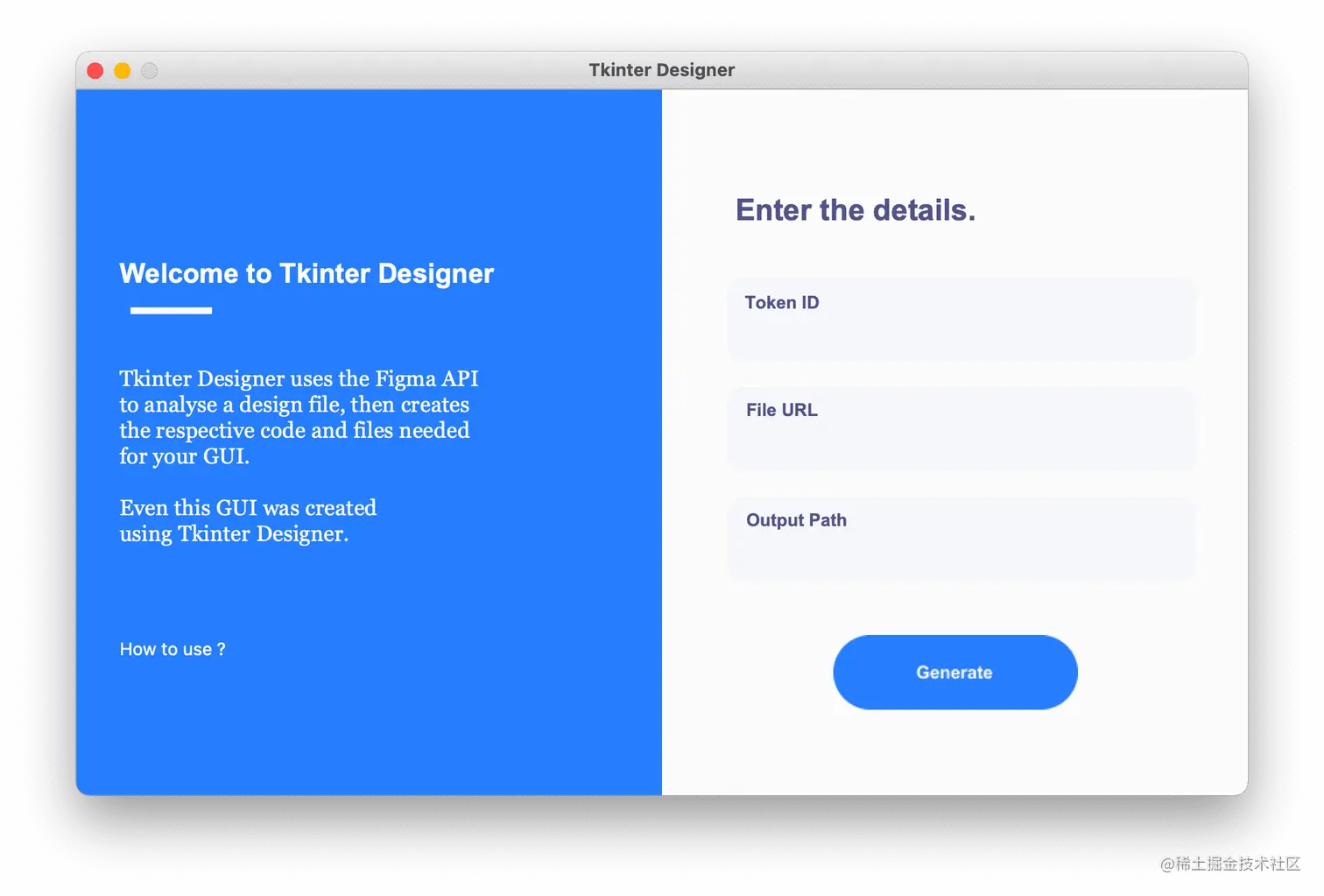 一个简单快捷的方法来创建 Python 图形用户界面,Tkinter Designer 旨在加速 Python 中的 GUI 开发过程。因为使用到 Figma,所以它能方便地在 Python 中创建漂亮的 Tkinter GUI。它借助 Figma API 来分析设计文件并创建 GUI 所需的相应代码和文件。