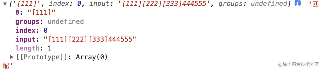 可以看到, 我们本想匹配[111], 结果所有方括号都被匹配到了, 这就是正则'贪婪'的一面; 而如果我们将正则改为/[[^=]+?]/, 即量词+后面加上'?', 匹配的结果就成了: