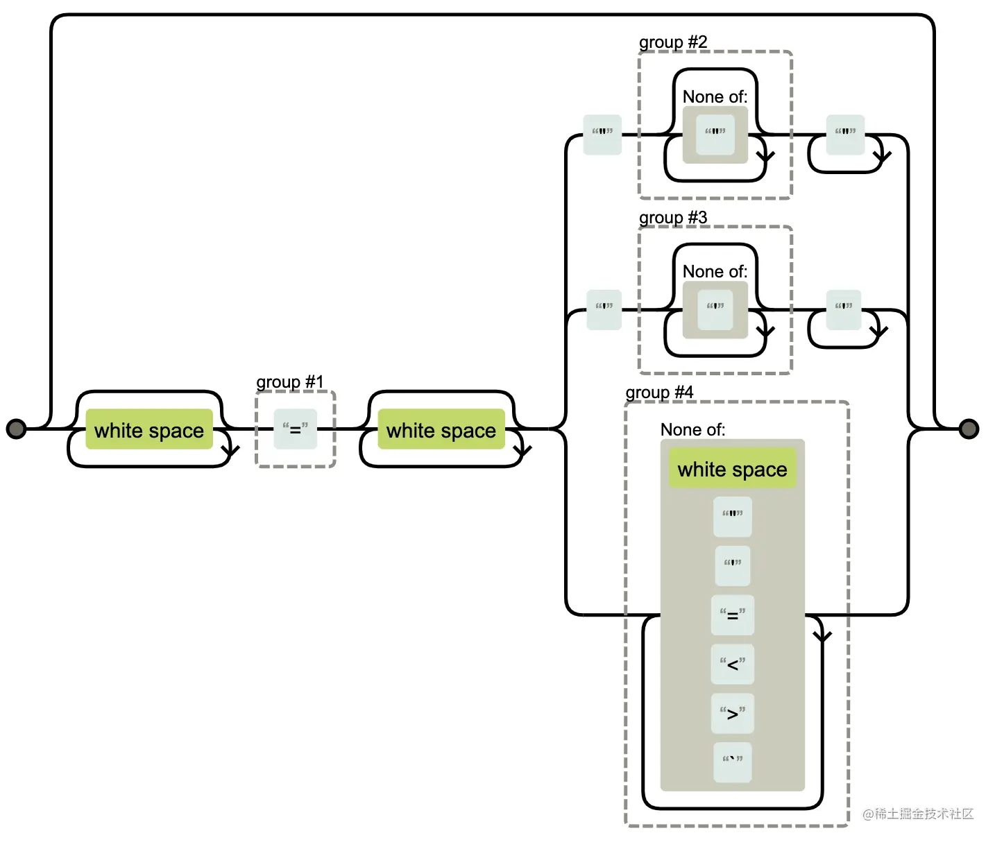 - 继续往里看, \s*(=)\s*就不解释了, 再往后, 发现里面又有一个非捕获性分组, 结构为(?:情况1|情况2|情况3) 是属性值的匹配