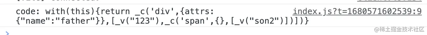 render结果: with(this){return _c('div',{attrs:{"name":"laowang"}},[_v("123")])}