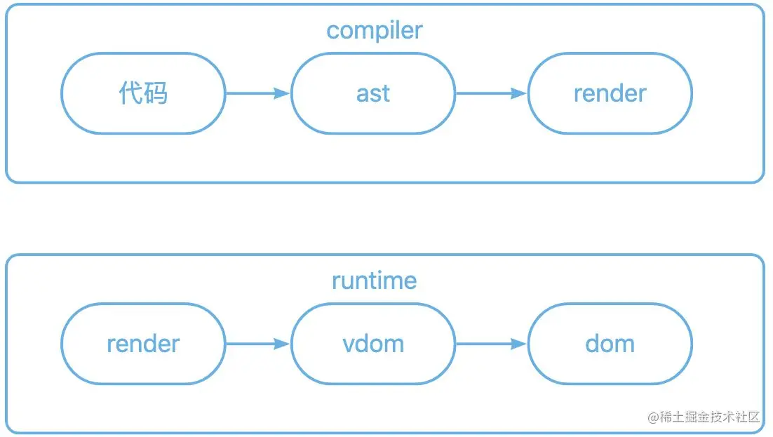 - ast 转 render: 其实就是一段代码了, 但是是字符串的形式, 最终将被new Function方法转为真实代码并执行