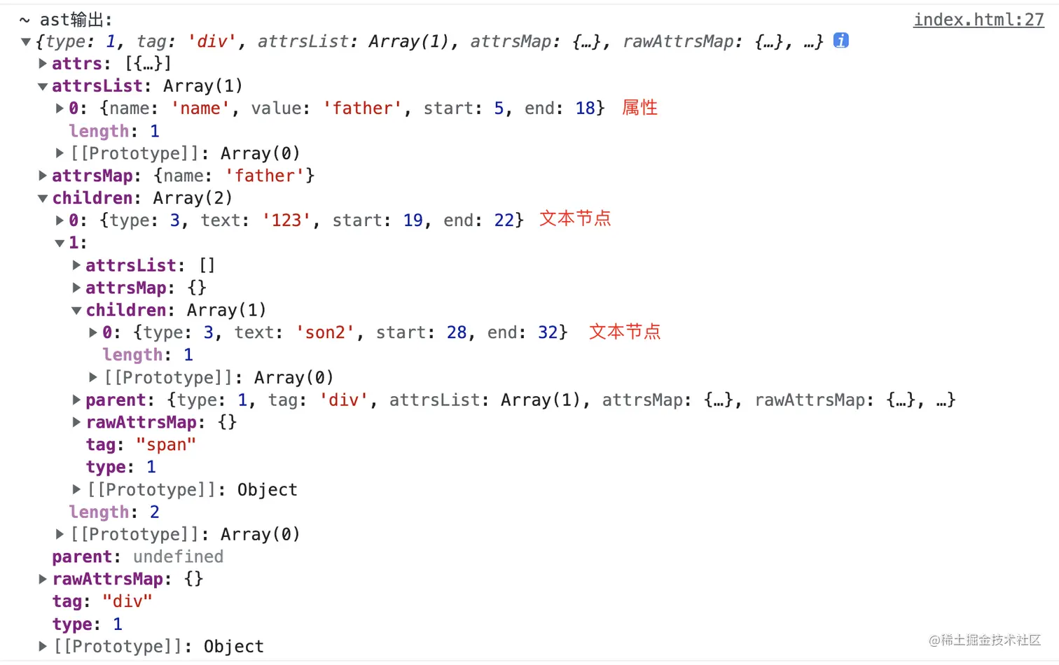 - 总体思路是, 将ast中, 表示节点/属性/子节点的部分转换为对应的字符串方法;