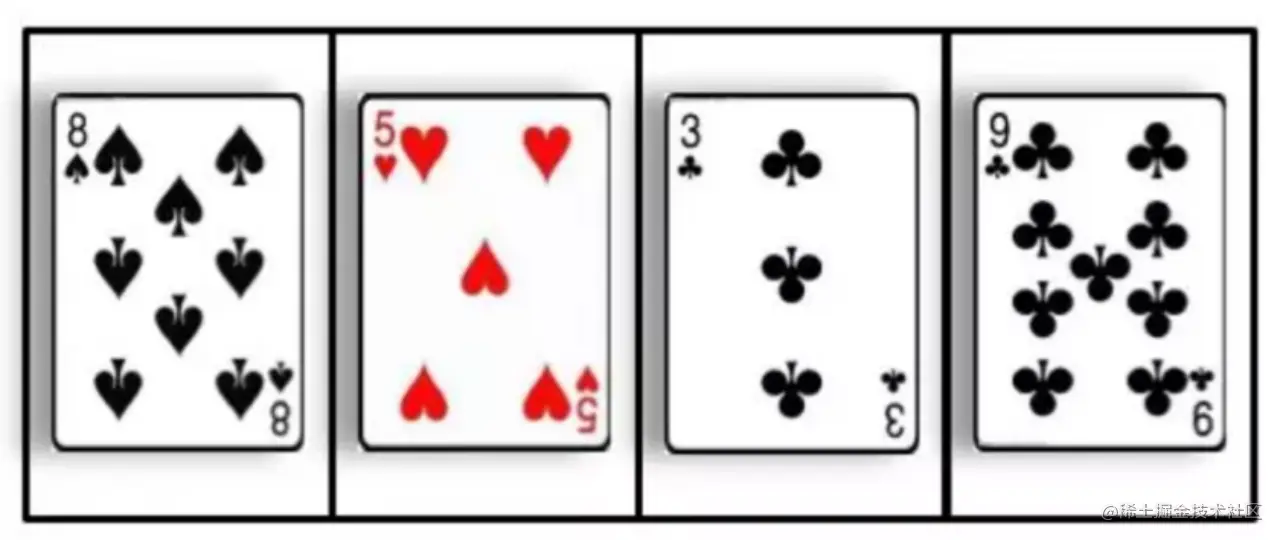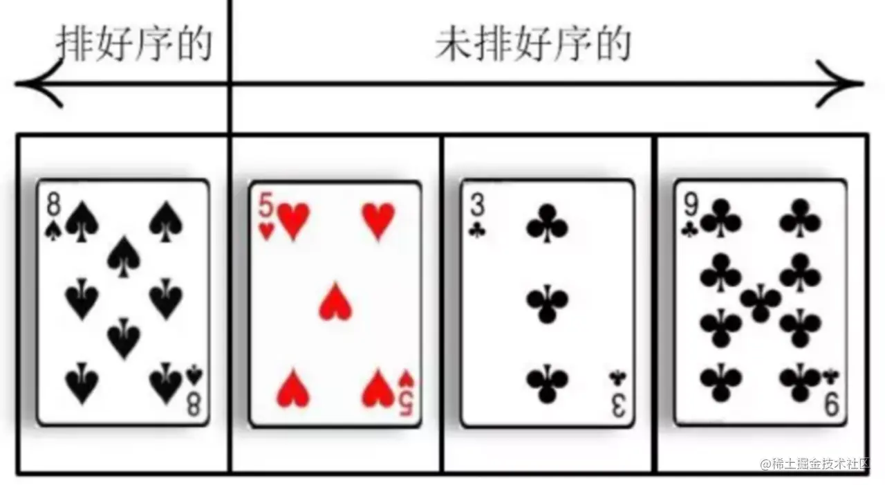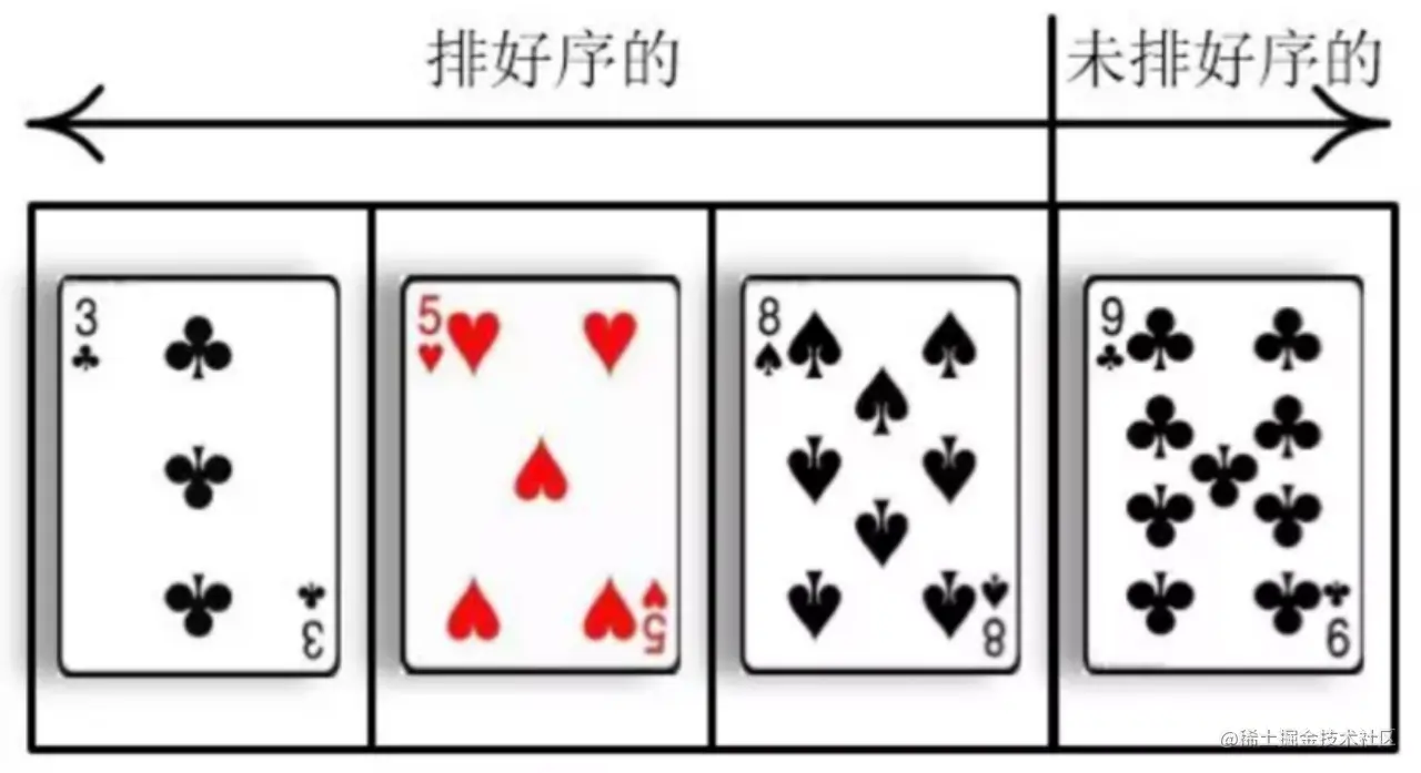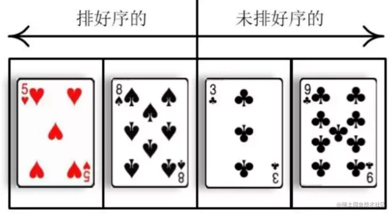 直接插入排序(Insertion Sort) ,顾名思义就是把未排序的元素一个一个地插入到有序的集合中,插入时把有序集合从后向前扫一遍,找到合适的插入位置。 为了让大家更好地理解插入排序,壹哥通过一个简单的例子给大家解释一下插入排序的含义,我们以日常生活中的纸牌游戏为例: