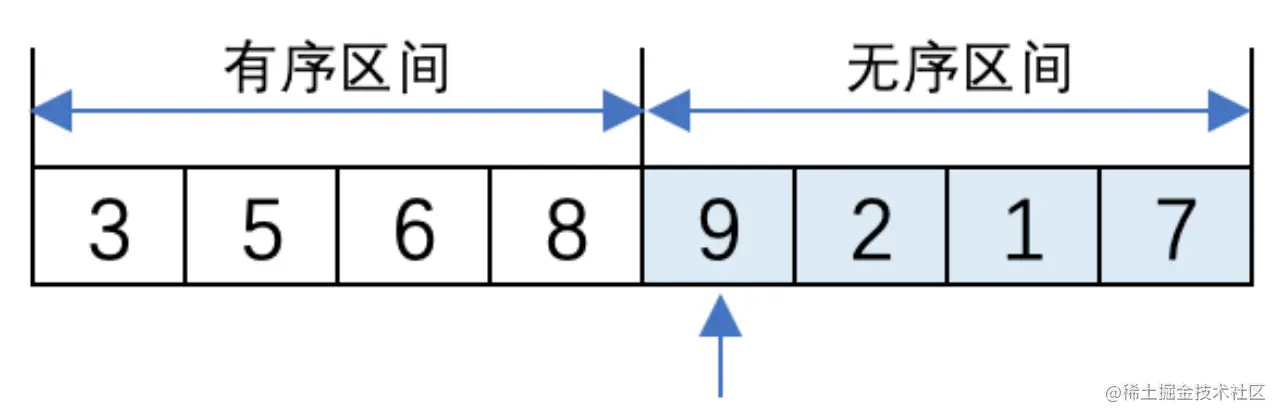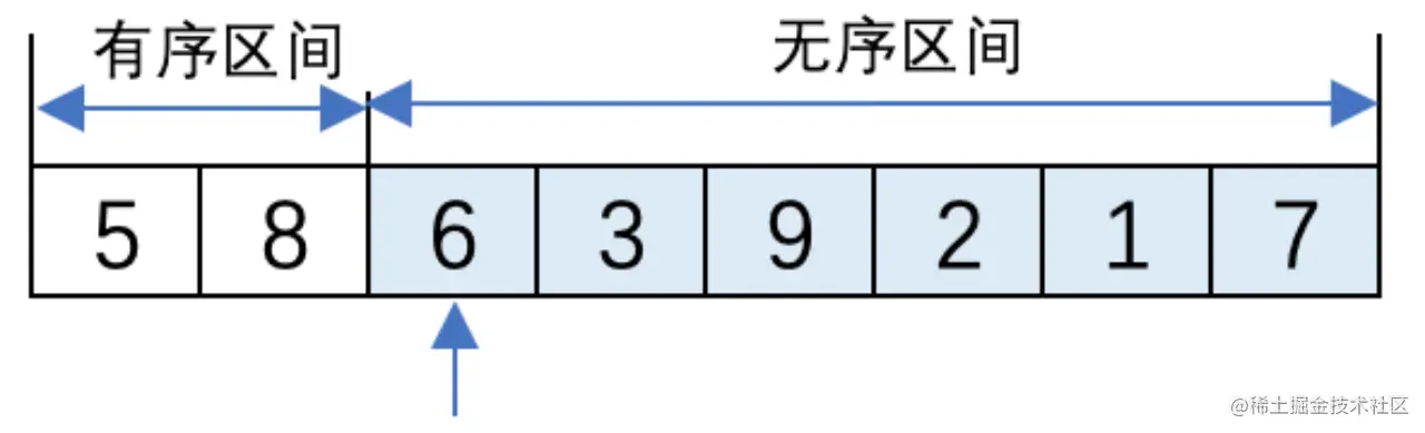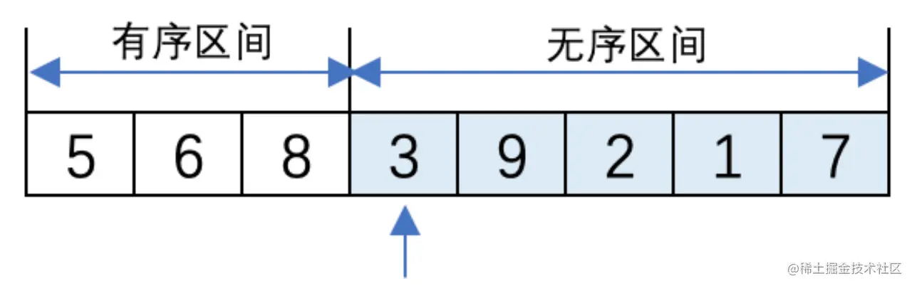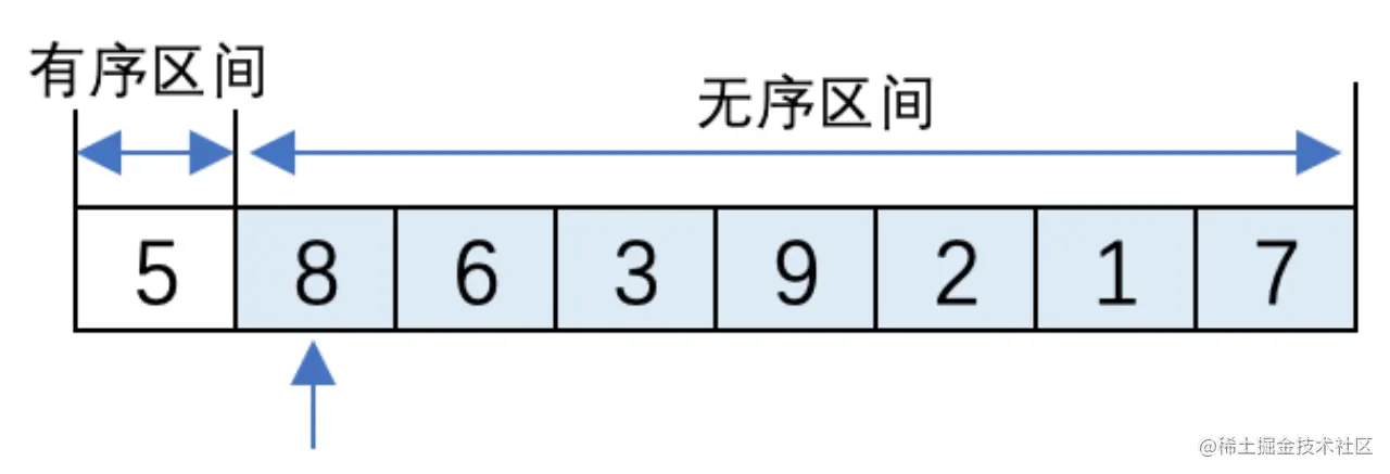 (1). 初始时,有序区间中只有5,无序区间中有8、6、3、9、2、1、7。