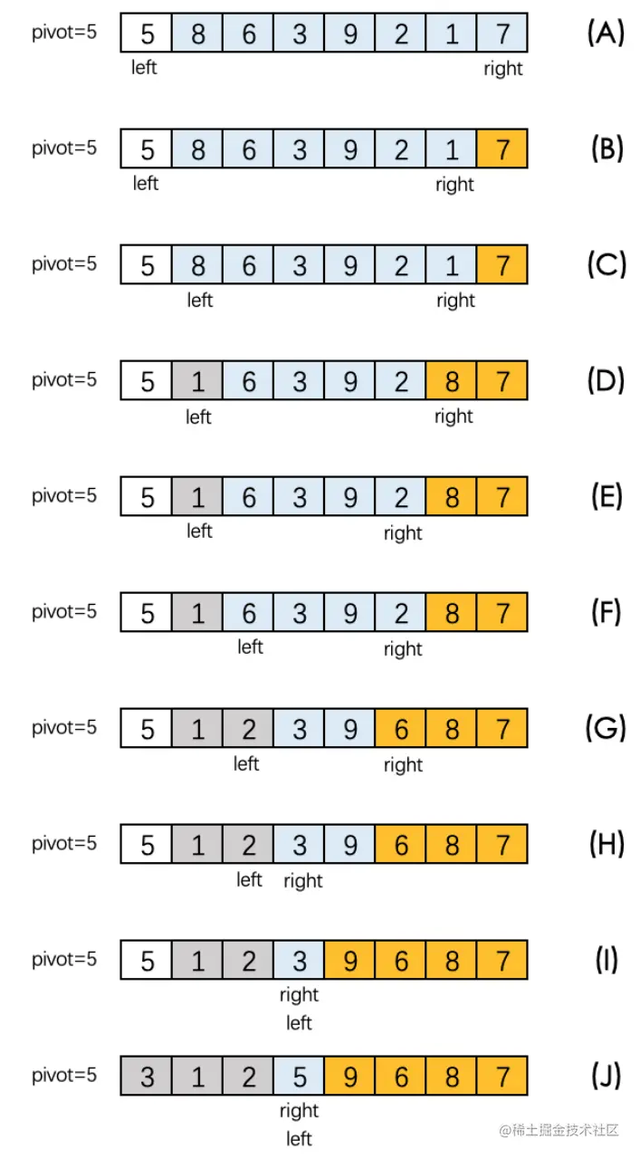- 接下来,left和right所指向的元素进行交换。此时形成数列为[5, 1, 2, 3, 9, 6, 8, 7]。
