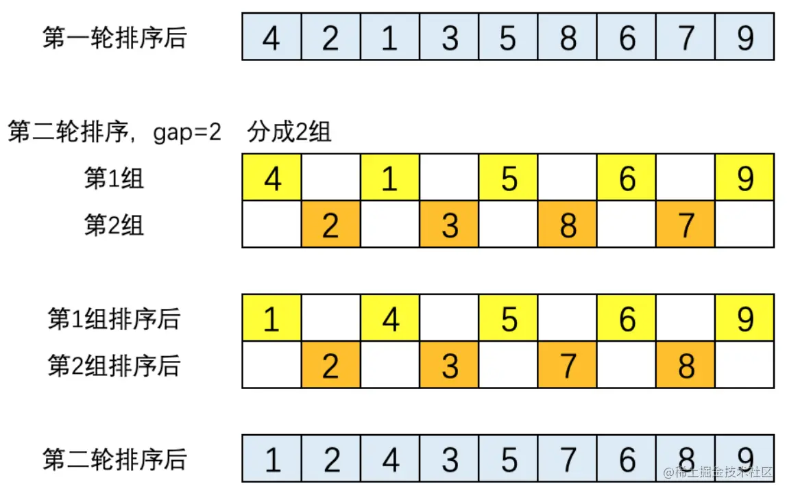 (2). 第二轮排序,gap = 2,将数列分成2组。两组的元素分别是[4,1,5,6,9]和[2,3,8,,7]。这两个组分别执行直接插入排序后的结果为[1,4,5,6,9]和[2,3,7,8]。将两组合并后的结果为[1,2,4,3,5,7,6,8,9],如下图所示。