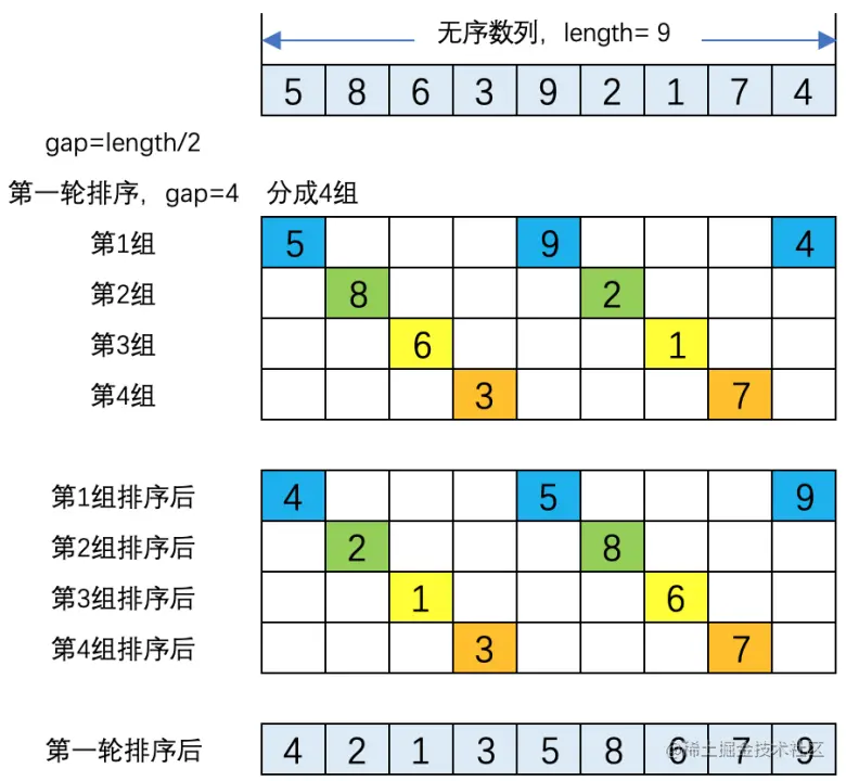 (1). 把元素按步长gap分组,gap的数值其实就是分组的个数。gap的起始值为数列长度的一半,每循环一轮gap减为原来的一半。