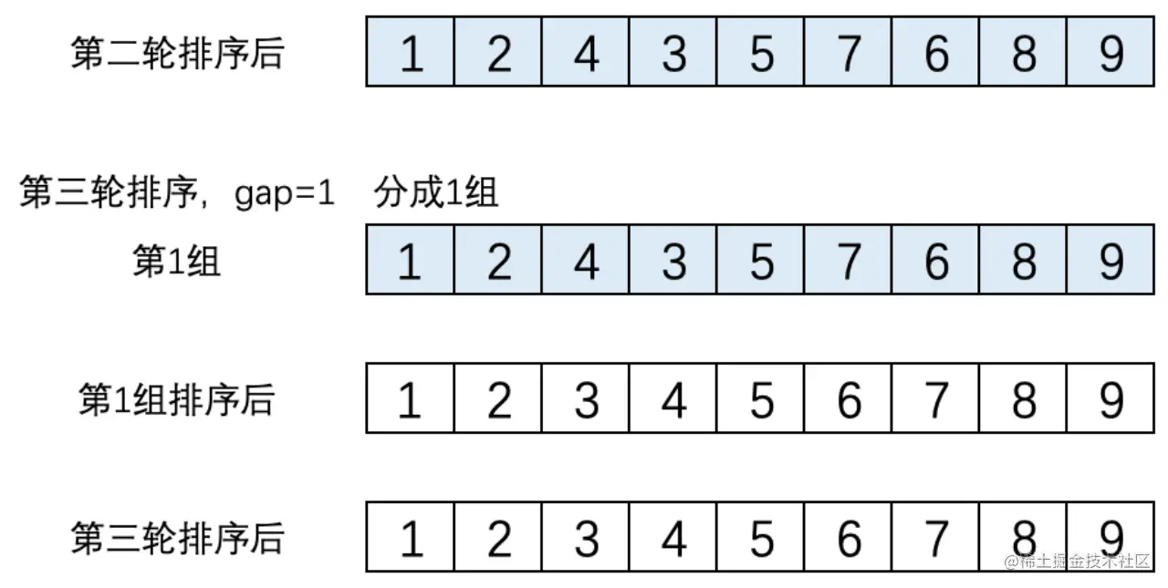 (3). 第三轮排序,gap = 1,数组就变成了一组。 该组的元素是[1,2,4,3,5,7,6,8,9],这个组执行直接插入排序后结果为[1,2,3,4,5,6,7,8,9],这个结果就是第三轮排序后得到的结果。此时排序完成,如下图所示。