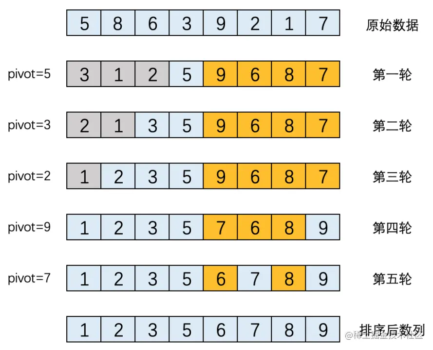 (4). 基准元素5的后半部分[9, 6, 8, 7],以9为基准元素进行排序,结果为:[7, 6, 8, 9],本轮下来,本轮的基准元素9的位置就是其最终位置。