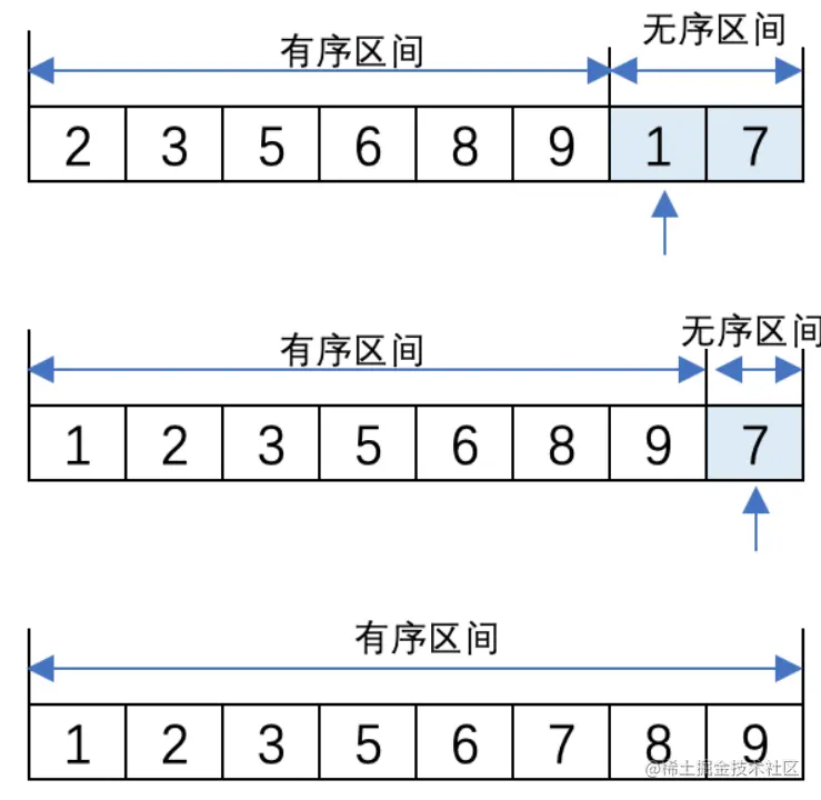 (4). 将无序区间的第一个元素3插入到有序区间的末尾,形成5、6、8、3的排列顺序。3和左侧的8比较大小,3比8小则换位;3再与6比较大小,3比6小则继续换位;3与5比较大小,3比5小继续换位。最后形成3、5、6、8的排列,此时,有序区间中是3、5、6、8,无序区间中还有9、2、1、7。