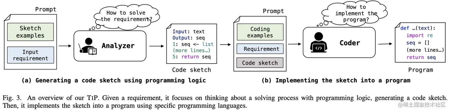 大型语言模型(LLMs)(例如ChatGPT)在代码生成方面表现出了令人印象深刻的性能。一项大规模研究表明,编写程序需要编程思维,即分析和实现编程逻辑中的要求(例如,顺序、分支、循环)。现有研究使用LLMs直接从要求生成程序,而不明确介绍编程思维。本文探讨如何在代码生成中解锁LLMs的编程思维,并提出了一种名为TIP的方法。我们的想法是将代码生成分解为两个步骤,并逐步引导LLMs分析和实现编程逻辑中的要求。具体而言,TIP首先生成一个代码草图,该草图使用编程逻辑提供高级解决方案,但省略了实现细节(例如API)。然后,TIP使用特定的编程语言将草图实现为程序。