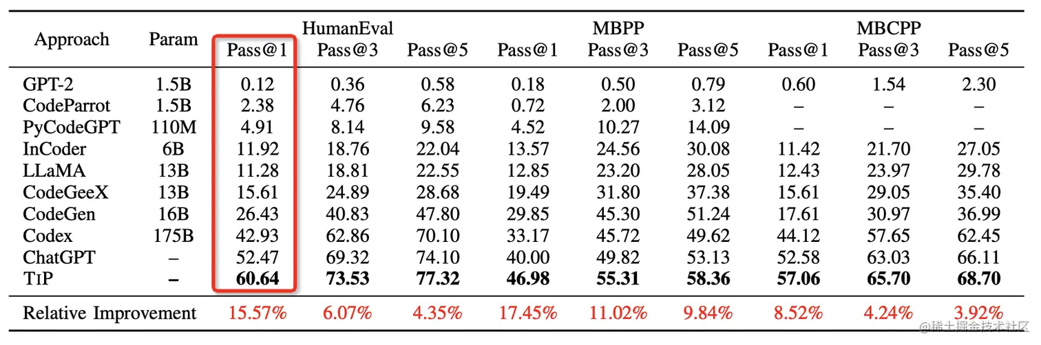 该论文发表于 2023 年 5 月,几乎是最新的关于 code generation 论文,它包含了最近三年各个 code generation 模型的效果对比,我们采用最基准的 HumanEval 作为基准验证集,可看见,即使在拆解步骤的情况下,一次生成的代码正确率也仅有 60%,ChatGPT(3.5)非步骤拆解的方式,一次生成正确代码的正确率也仅有 52%,但是,其参数规模已经高达 1750 亿。