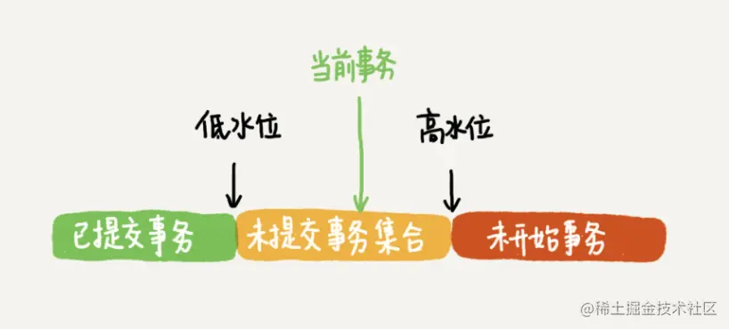 - 若 row trx_id 不在数组中,表示这个版本是已经提交了的事务生成的,可见。