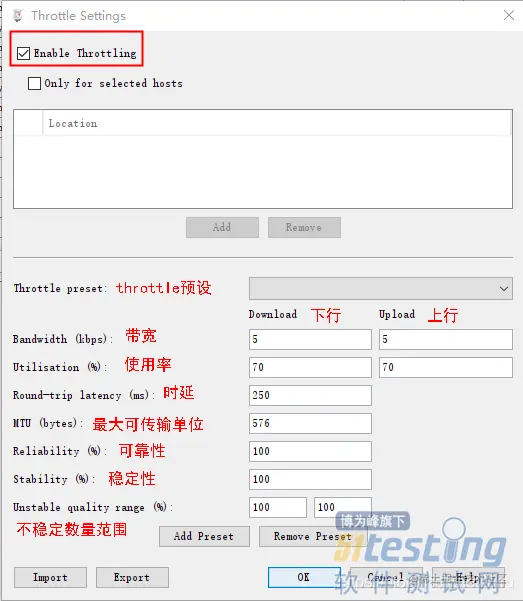 设置方式:charles-Proxy-Throttle Settings…,勾选Enable Throttling后就可以编辑了。