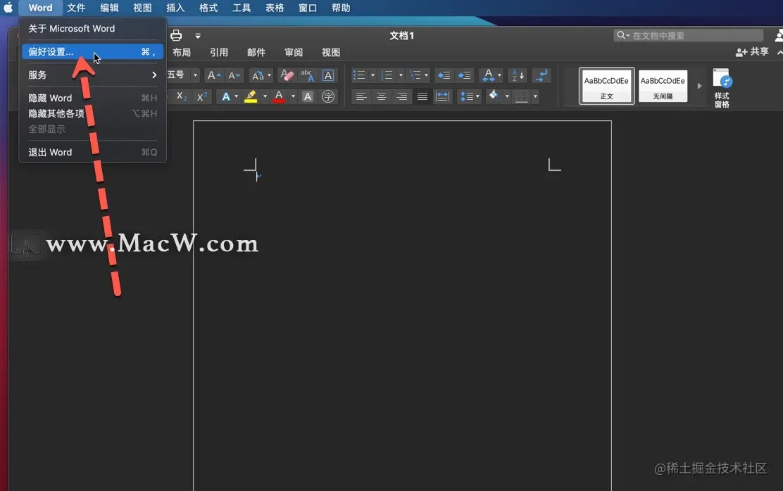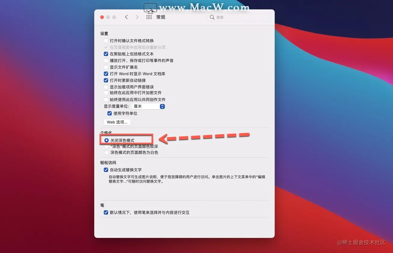 具体在Word的【偏好设置】->【常规】->【个性化】,选择第一个「关闭深色模式」即可