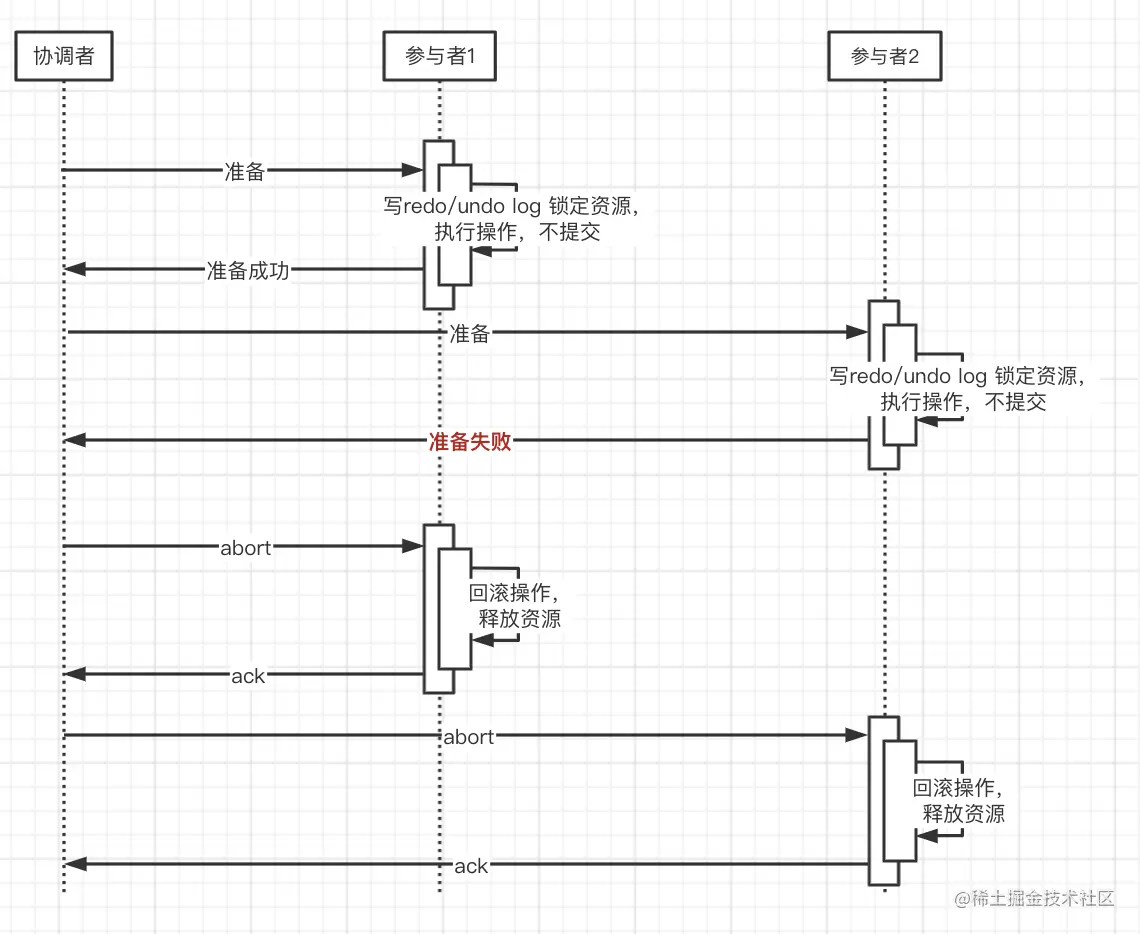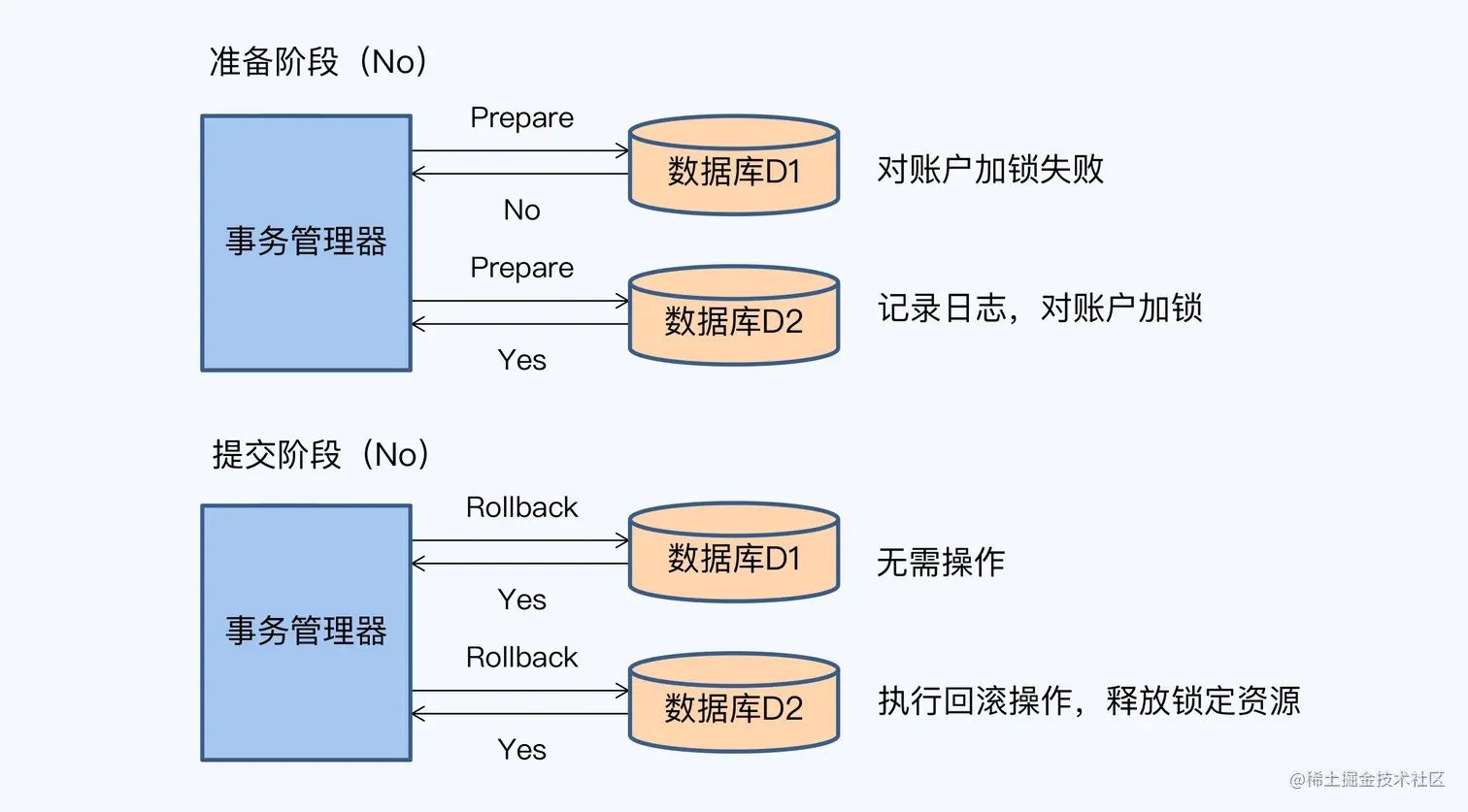 - 第二阶段,因为事务管理器发现数据库 D1 不具备执行事务的条件,只能向所有数据库发出“回滚”(Rollback)指令。所有数据库接收到指令后撤销第一阶段的操作,释放资源,并向协调者返回 Yes,事务结束。小明和小红的账户余额均保持不变。