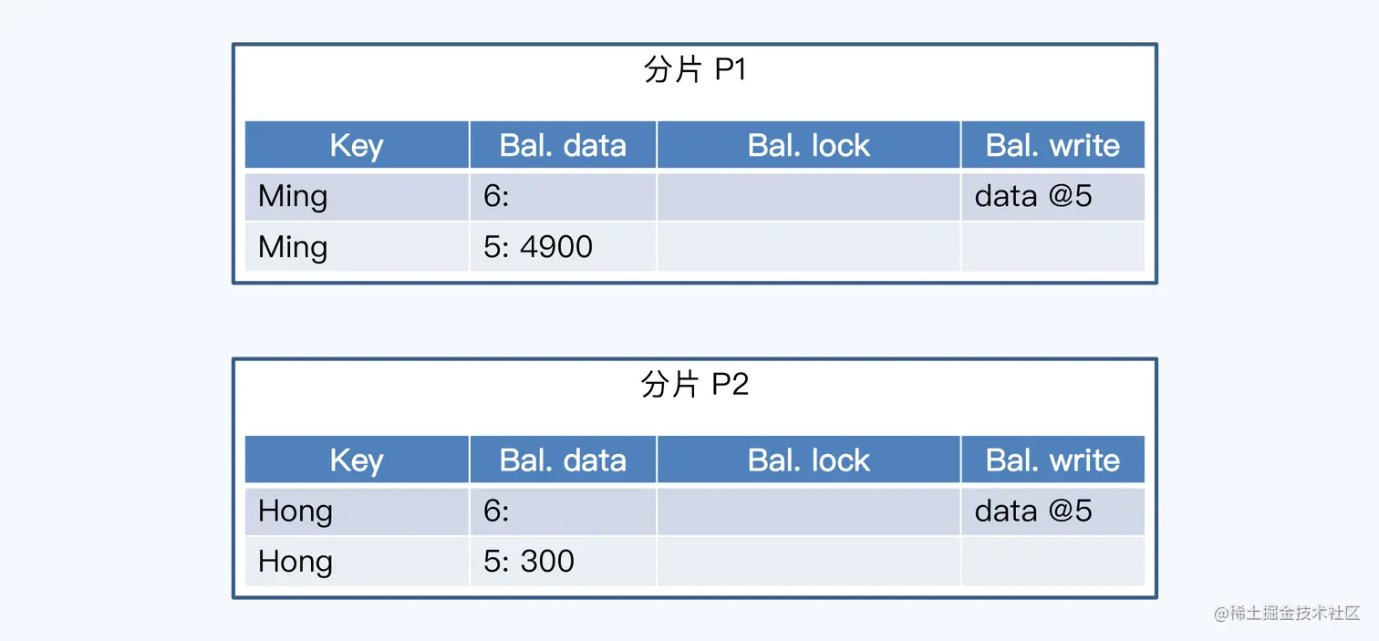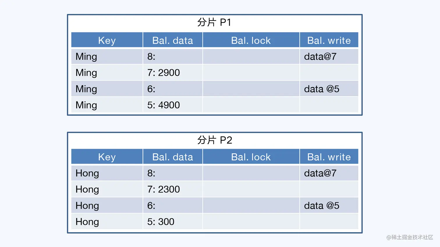 上图中的 Ming 代表小明,Hong 代表小红。在分片的账户表中各有两条记录,第一行记录的指针(write)指向第二行记录,实际的账户余额存储在第二行记录的 Bal. data 字段中。