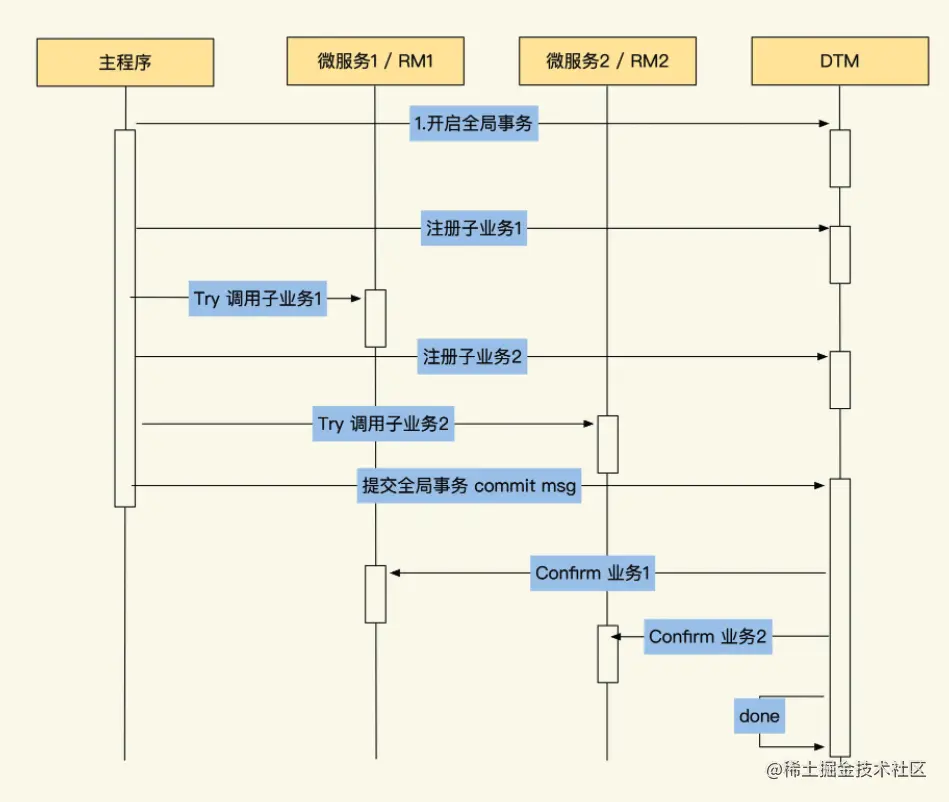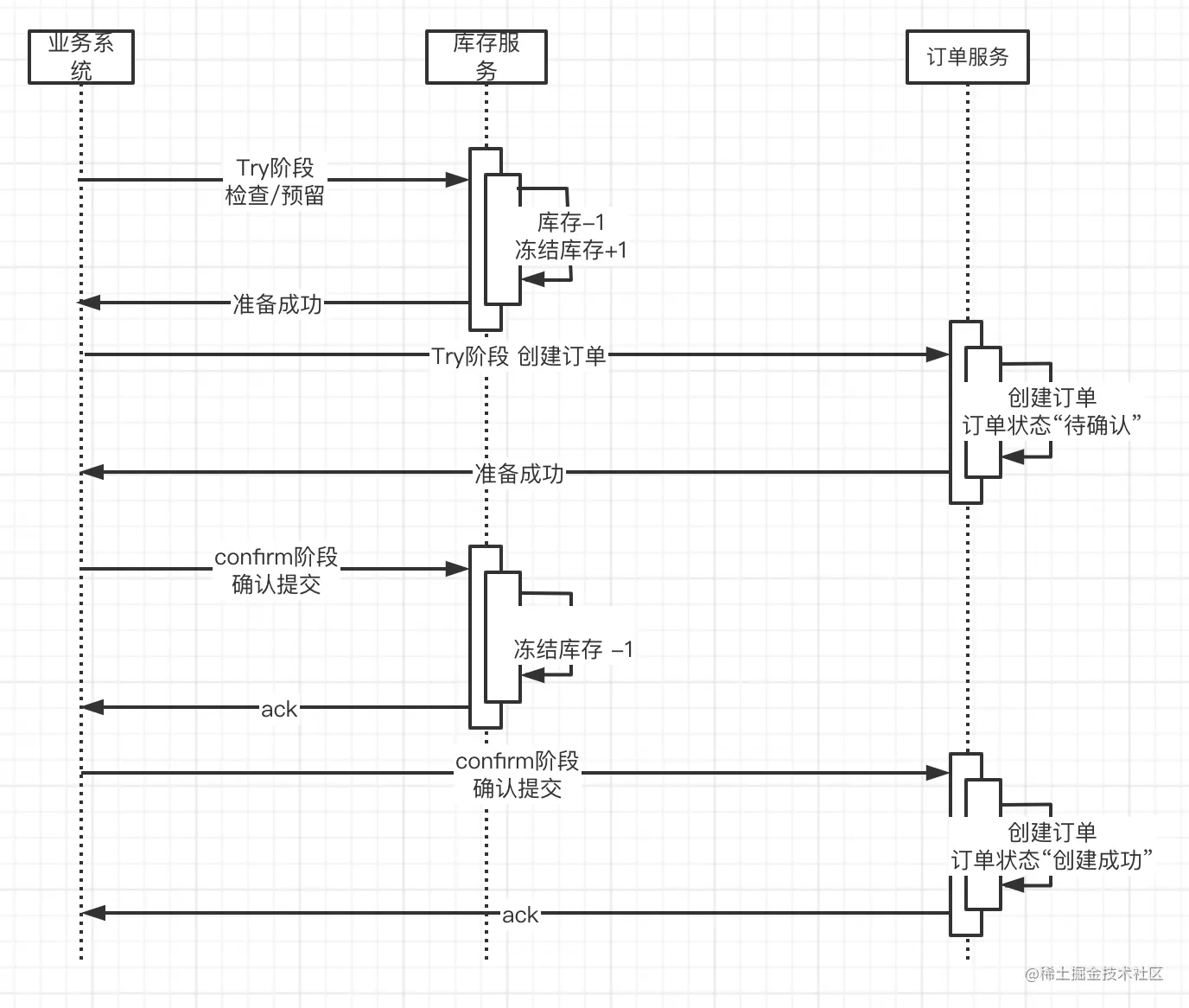 - 另一类是事务参与者,也就是具体的业务服务,可以是多个,每个服务都要提供 Try、Confirm 和 Cancel 三个操作。