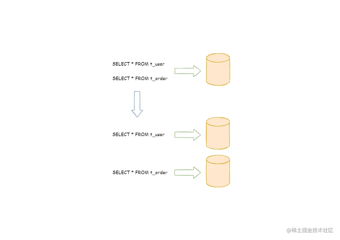 下图展示了根据业务需要,将用户表和订单表垂直分片到不同的数据库的方案。