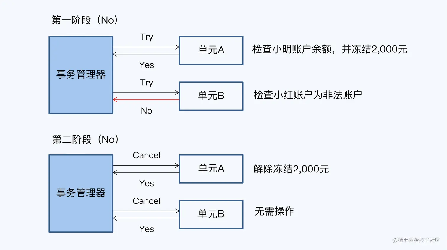 - 第一阶段,事务管理器发出 Try 指令,单元 B 对小红账户的检查没有通过,回复 No。而单元 A 检查小明账户余额正常,并冻结了 2,000 元,回复 Yes。