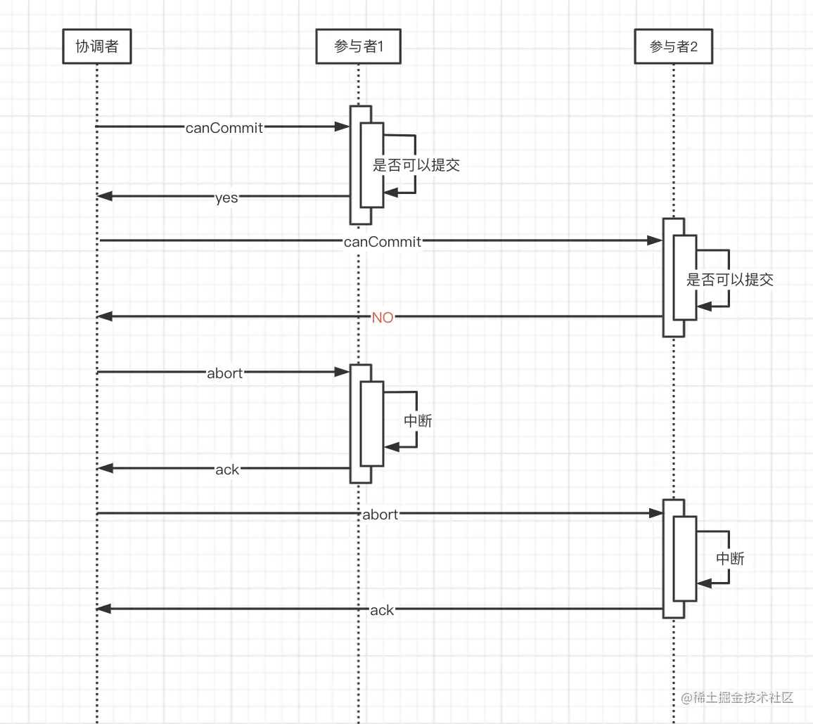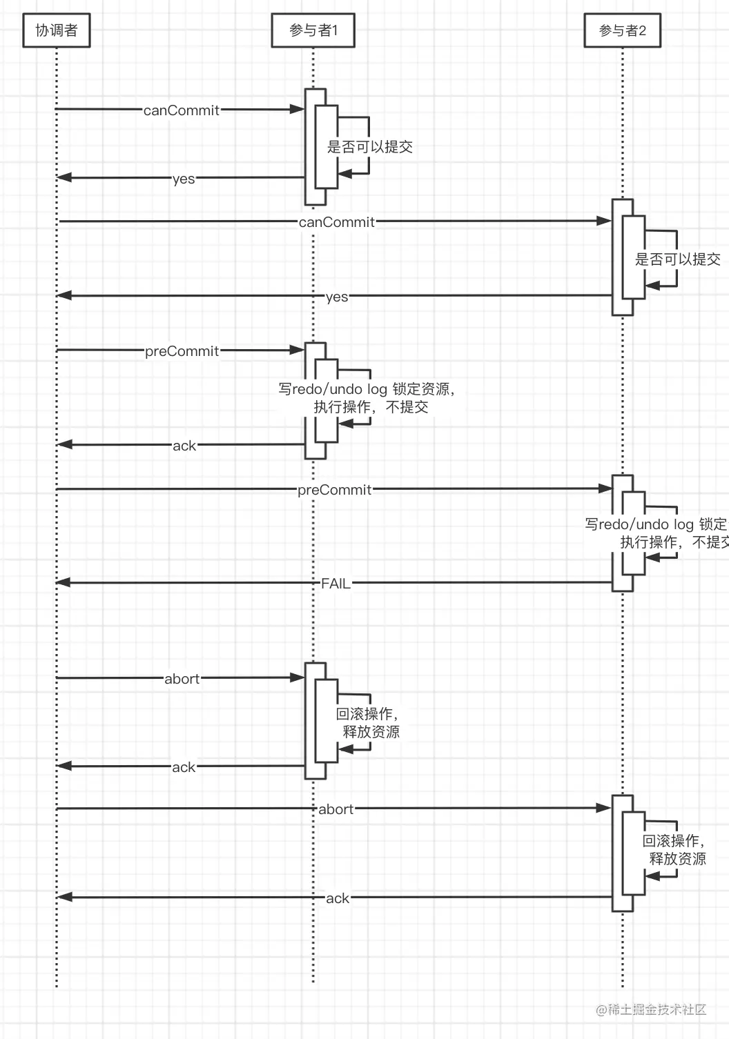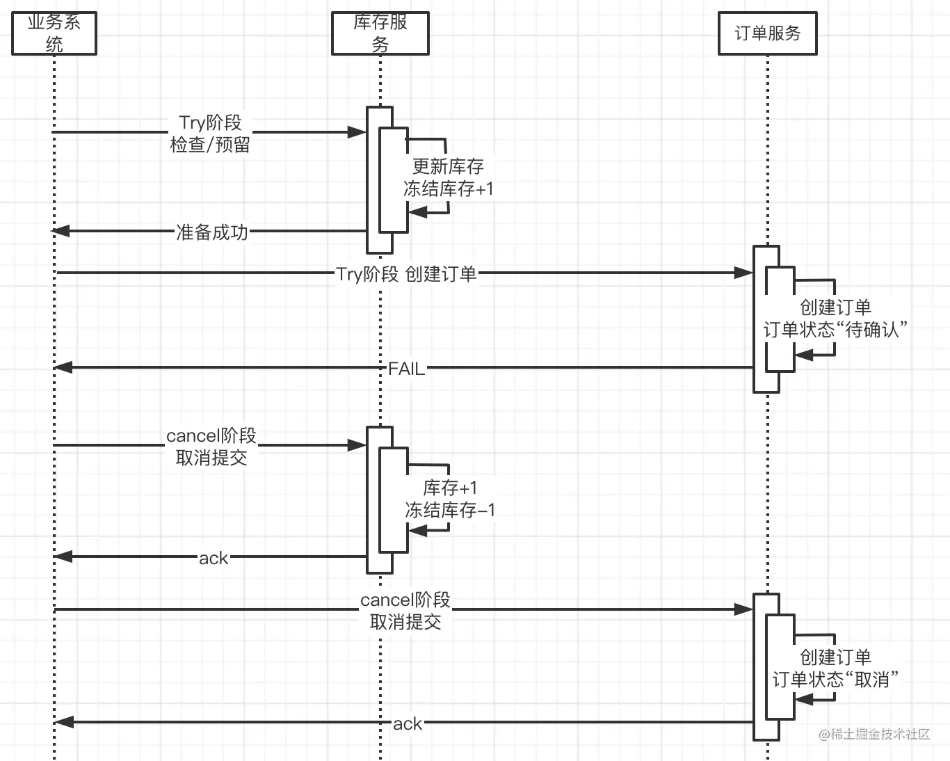 - 第二阶段,因为前面有参与者回复 No,所以事务管理器向所有参与者发出 Cancel 指令,让已经成功执行 Try 操作的单元 A 执行 Cancel 操作,撤销在 Try 阶段的操作,也就是单元 A 解除 2,000 元的资金冻结。